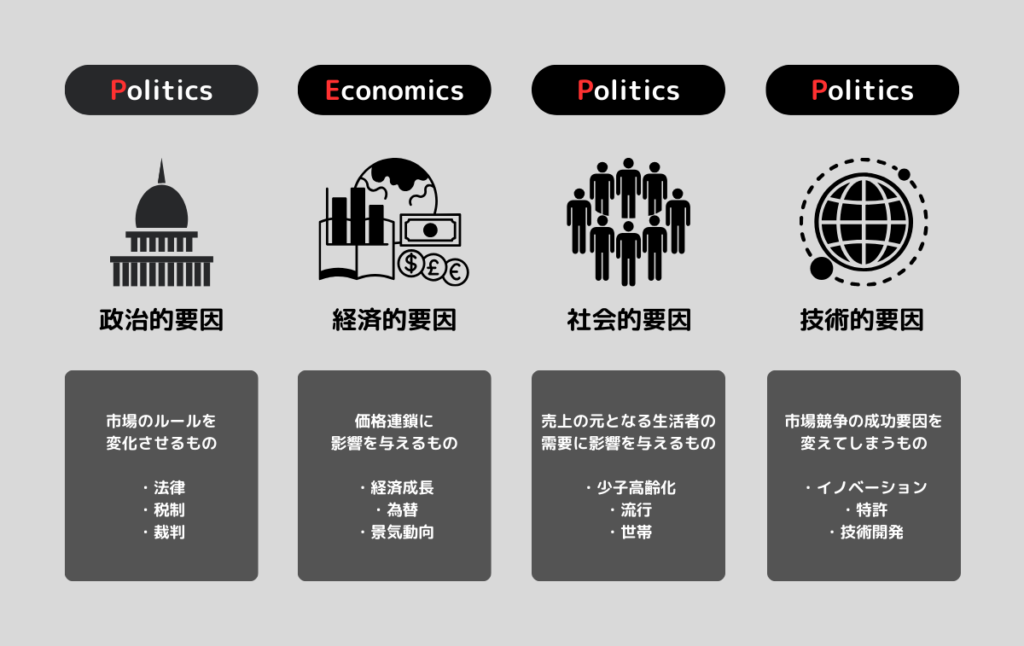 PEST分析は、Political(政治)、Economic(経済)、Social(社会)、Technological(技術)の四つの環境要因を評価し、ビジネス環境の変化に対応する手法です。事業展開する際、地域の政治的な状況や経済的な要因、社会的なトレンド、技術の進化などを考慮することが重要です。