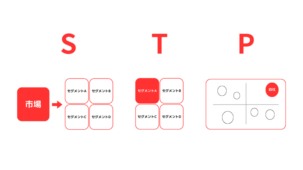 STP分析は、Segmentation(市場セグメンテーション)、Targeting(ターゲティング)、Positioning(ポジショニング)の三つの要素を組み合わせて、効果的なマーケティング戦略を立てる手法です。