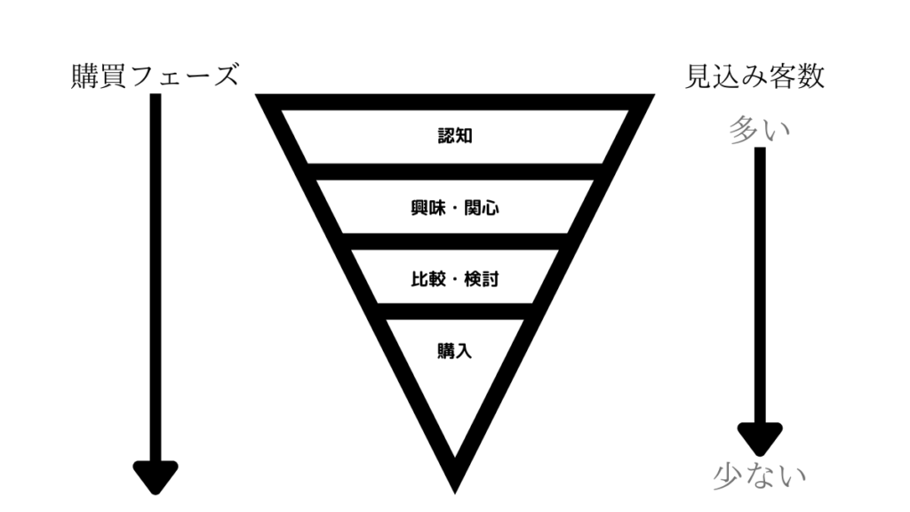 初めて商品やサービスに触れた顧客が、購買までのプロセスを段階的に示したものです。