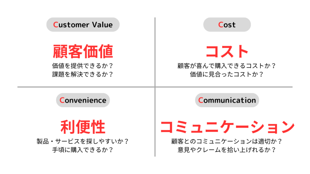 4C分析は、Customer(顧客価値)、Cost(コスト)、Convenience(利便性)、Communication(コミュニケーション)の四つの要素を分析します。