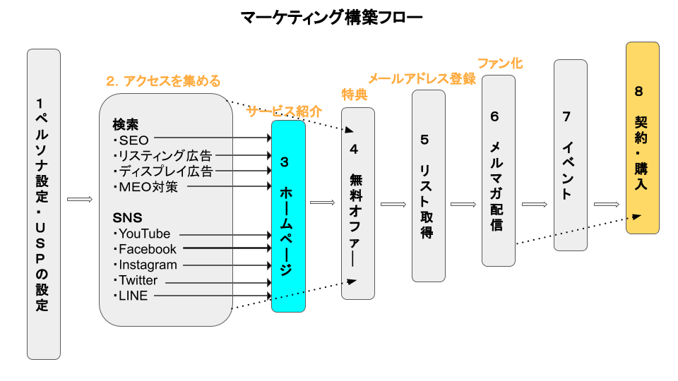 【アクセスを集める→見込み客のリストを取得する→リストに対して信頼を構築しファンになってもらい、商品・サービスを販売する】